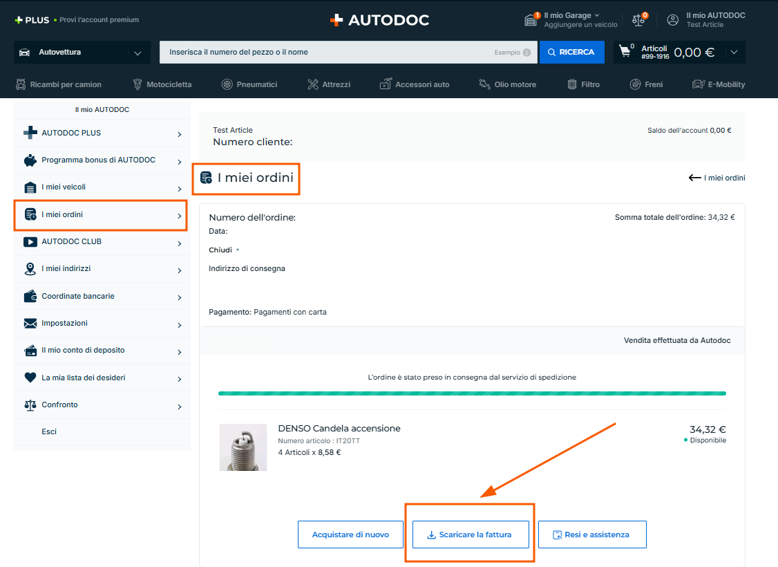 La fattura si trova su "Il mio AUTODOC → I miei ordini → Dettagli ordine → Scaricare la fattura".