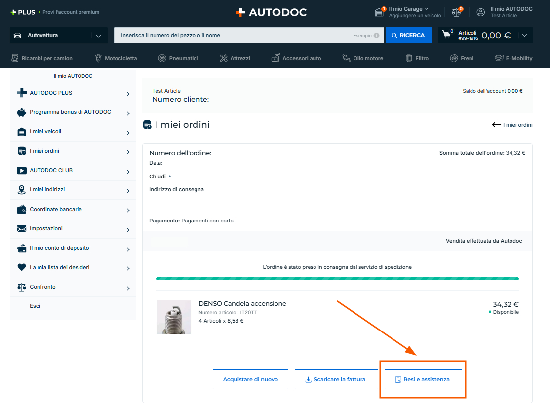 Se la fattura non è disponibile nella sezione "Il mio AUTODOC", contatta il venditore accedendo a Il mio AUTODOC, selezionando un ordine e cliccando sul pulsante "Resi e assistenza".