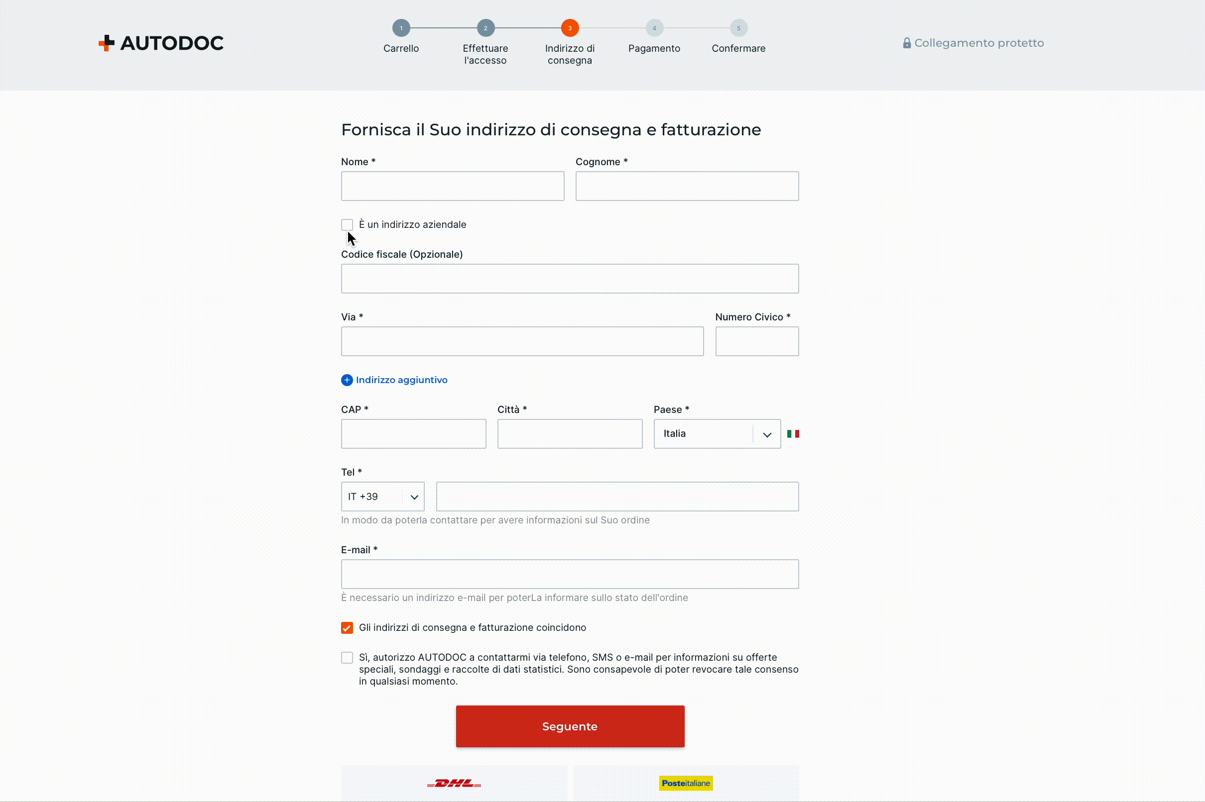 Se si desidera che gli indirizzi di consegna e di fatturazione siano diversi, è necessario deselezionare la casella di controllo “Gli indirizzi di consegna e fatturazione coincidono”.